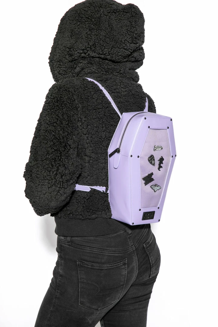 Faux leather coffin shaped backpack with a Pin Collecting Window. Faux leather material paired with matte black hardware. Features adjustable straps.