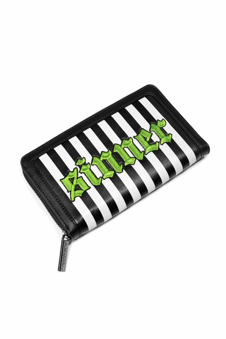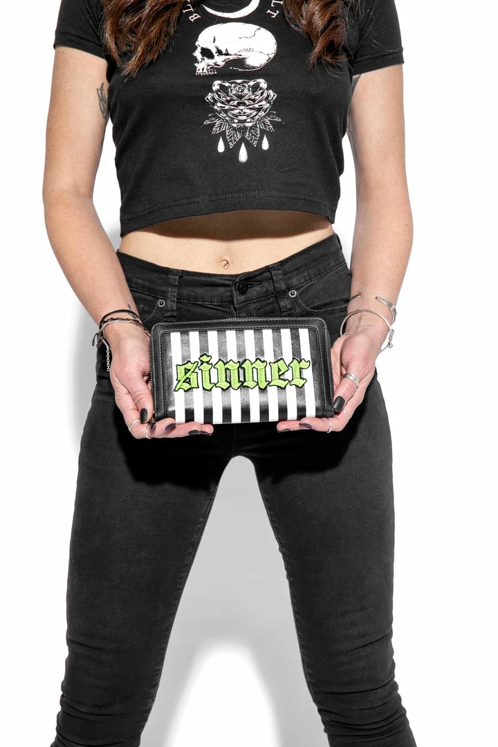 Faux leather zip around wallet with Sinner embroidered in green on front. Gunmetal finish Blackcraft logo zipper and metal plaque. Features interior zip pocket as well as 12 credit card slots and custom interior lining.