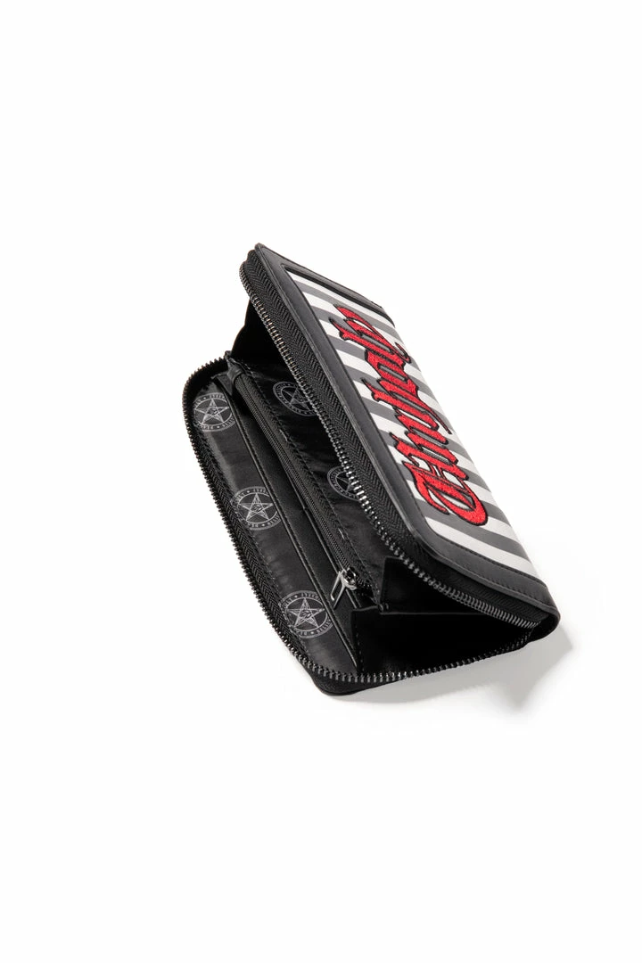 Faux leather zip around wallet with Unholy embroidered on front. Gunmetal finish Blackcraft logo zipper and metal plaque. Features interior zip pocket as well as 12 credit card slots and custom interior lining.