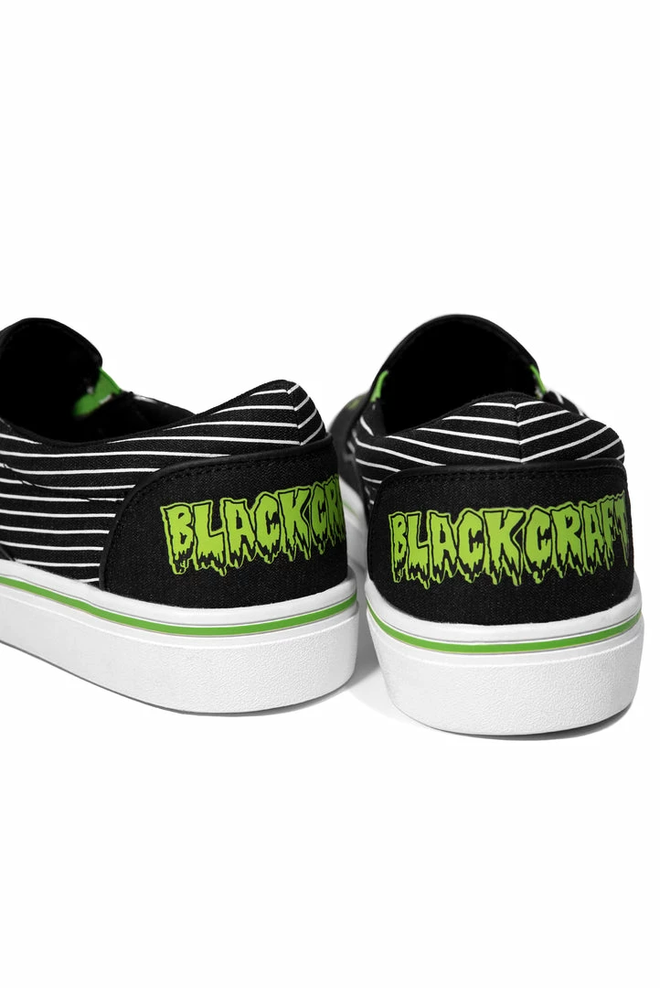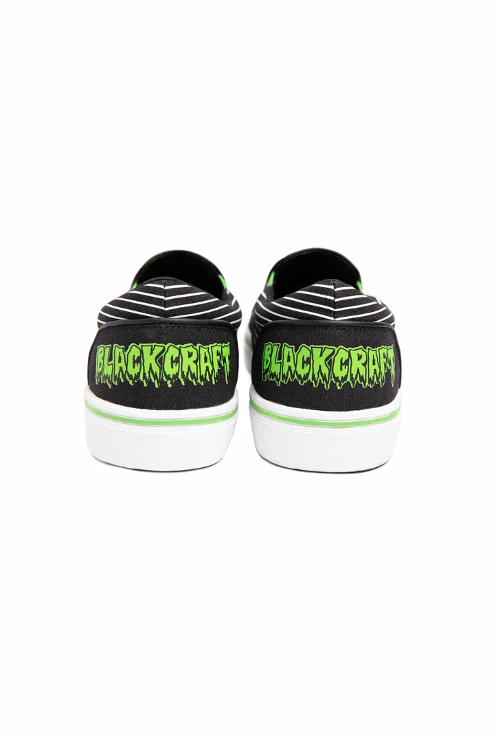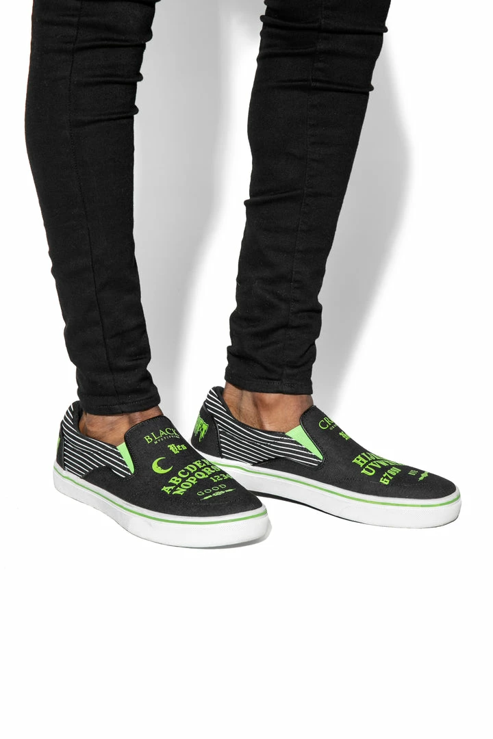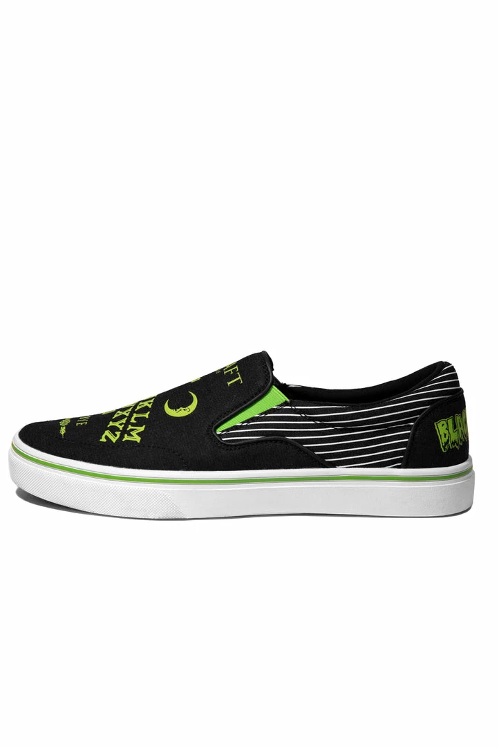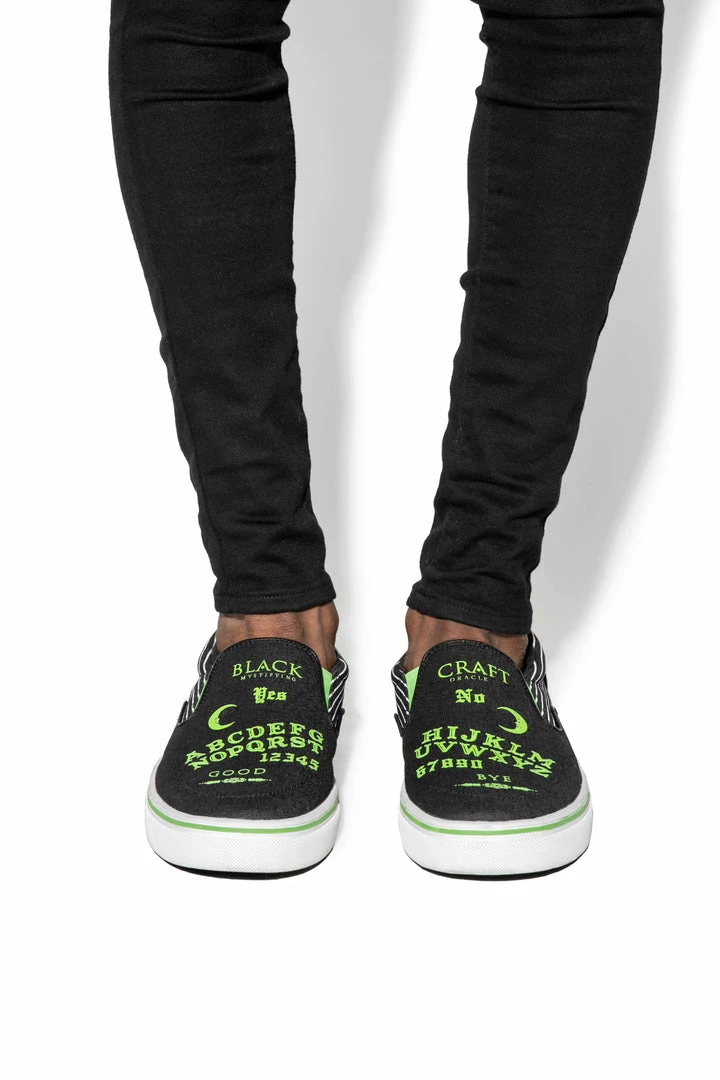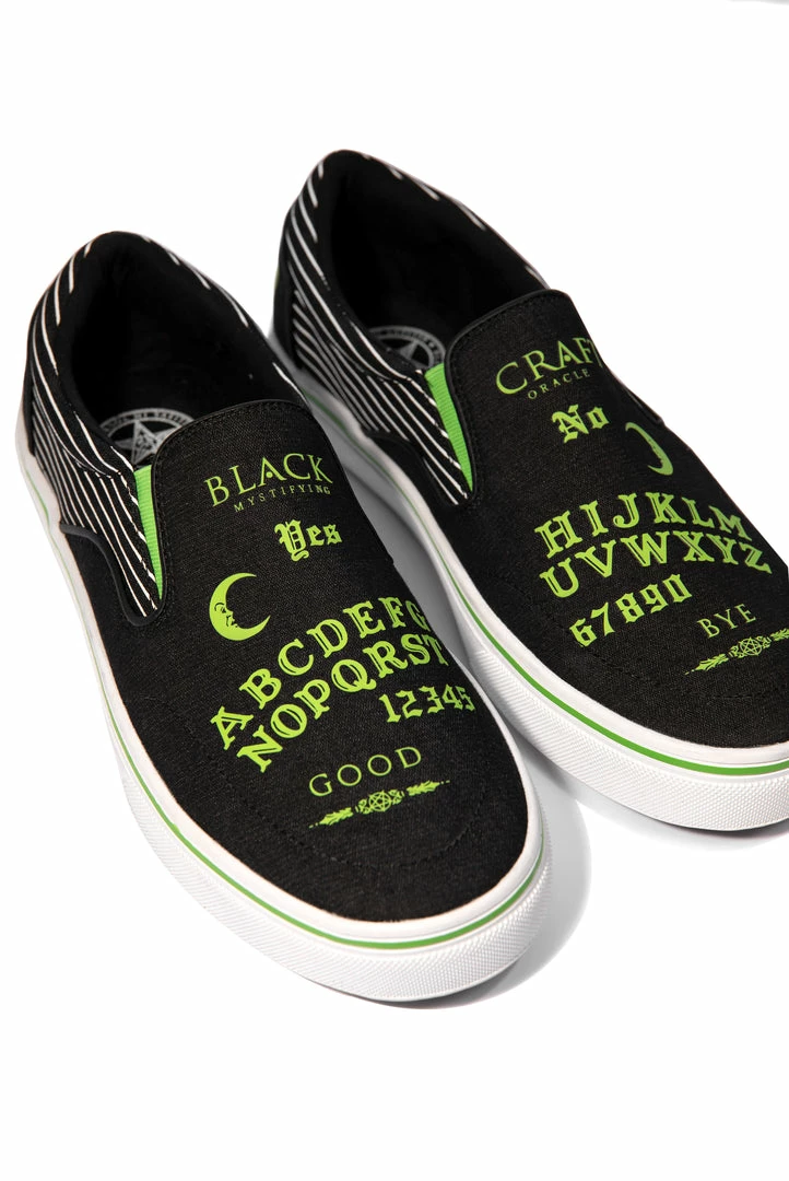 Unisex style slip on sneaker featuring our signature Ouija artwork on black canvas fabric upper and custom Blackcraft logo rubber sole.